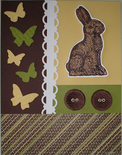 This card (or a slightly tweaked version) is one of the cards we'll make at the March 4 class. Contact me today to register. The chocolate bunny looks so cool when embossed. Sorry about the poor photography. I tried photographing the card in three different places and this is the best I could get. The colors are much richer in person. The embossing isn't a whole lot better, though. I tried to use classic ink, even though I knew better and that's why only half of it's embossed :) I've ordered Craft ink for the class so your bunnies will all look shiny and chocolately and yummy.