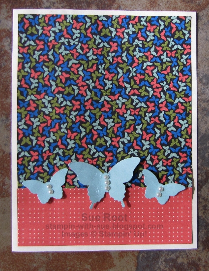 I started with this card. It matches the sketch pretty closely. The Designer Series Paper (DSP) is from the Pretty Petals DSP Stack. The punches are Elegant Butterfly and Bitty Butterfly.